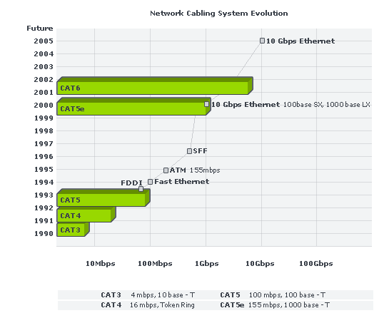 Category 6 (CAT 6) technology is rapidly growing in the telecommunications industry’s commercial market. CAT 6 has been under development since late 1997. Originally, the wiring was intended to go from the 100 MHz capability of CAT 5 to 200 MHz, but later that was revised to 250 MHz. CAT 6 provides for other metrics as well, variables that become important at high bandwidth rates. These include crosstalk, or interference between wire pairs, and skew, the difference in timing of signals on the wires. CAT 6 is the latest type of four pair twisted copper cable designed for high speed data transmission. CAT 5 was initially touted as the last cable you'll ever need, but then came Gigabit Ethernet, which pushed the technology to its limits and used all four pairs of wires in the cable. So, manufacturers started making, "enhanced", versions of the cable (hence the "E”). Bandwidth precedes data rates just as highways come before traffic. Doubling the bandwidth is like adding twice the number of lanes on a highway. The trends of the past and the predictions for the future indicate that data rates have been doubling every 18 months. Current applications running at 1 Gb/s are really pushing the limits of Category 5E cabling. As streaming media applications such as video and multi-media become increasingly commonplace, the demands for faster data rates will increase and spawn new applications that will benefit from the higher bandwidth offered by Category 6. This is exactly what happened in the early ’90s when the higher bandwidth of Category 5 cabling compared to Category 3 caused most local area network (LAN) applications to choose the better media to allow simpler, cost effective, higher speed LAN applications, such as 100BASE-TX. It is also important to note that cabling infrastructure is generally considered a 10 year investment as opposed to one or three years for electronics or software.