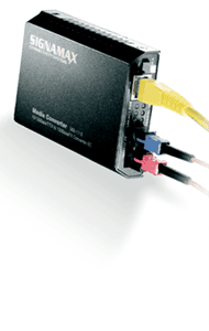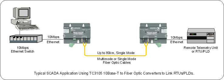 (2) Diagram (2) In this diagram you clearly see the PC on the left- it could be your office , home or any locations. The PC is plugged into your ethernet switch or router (or sometimes both).Then there is an ethernet CAT 5e patch cord or CAT 6 patch cable tying the ethernet switch to the fiber optic media converter.The signal goes into the fiber optic media converter- GETS CONVERTED into digital light pulses which go through the other end of the fiber cable into your other media converter. The fiber optic media converter can be from 10Mbps-100- 1000 or a multi use media converter with several speeds. The YELLOW LINE indicates a fiber optic cable which can be mulitmode or singlemode- and this distance can be from 100 meters to 80 kilometers. You also need to let us know what type of fiber optic CONNECTORS you ned that will connect the FIBER OPTIC MEDIA CONVERTER to the FIBER CABLE. Typically most people use SC or ST, LC being used mostly for commercial applications which use Cisco routers or other higher end switches and routers.