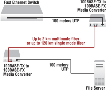 (1) Diagram (1)In this diagram below you see two networks-the GRAYLINE indicating a LAN that ties in any commuter system using CAT 5e or CAT 6 ethernet UTP copper cable to a media converter and or a switch and the RED LINE or LINK Below indicating up to a 2 kilometer link using fiber optic cable. The fiber optic cable in this diagram shows using singlemode fiber optic cable. In many situations one can use multimode cable that is rated as an 'indoor- outdoor' fiber optic cable as well- instead of a singlmode cable. The other important components in designing your system in knowing the length of your cable runs- and always include a minimum of 10% additional cable for "overage" or miscalculation. You would hate to have a 1000 foot custom fiber optic cable made - only to find out you needed 1025 feet! You also need to let us know what type of fiber optic CONNECTORS you ned that will connect the FIBER OPTIC MEDIA CONVERTER to the FIBER CABLE. Typically most people use SC or ST, LC being used mostly for commercial applications which use Cisco routers or other higher end switches and routers.