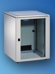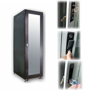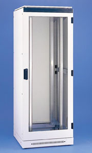 Its innovative design is based on the use of aluminum profiles for the four vertical pillars, which are connected solidly to two welded steel end-frames. This results not only in low weight and an elegant appearance, but also permits quick assembly. Due to the rigidity provided by the steel end-frames, our data cabinet is able to handle equipment loads of up to 770 to 1500 lbs. This means it an ideal choice for mid-range use as a Server enclosure, or for network cabling purposes.